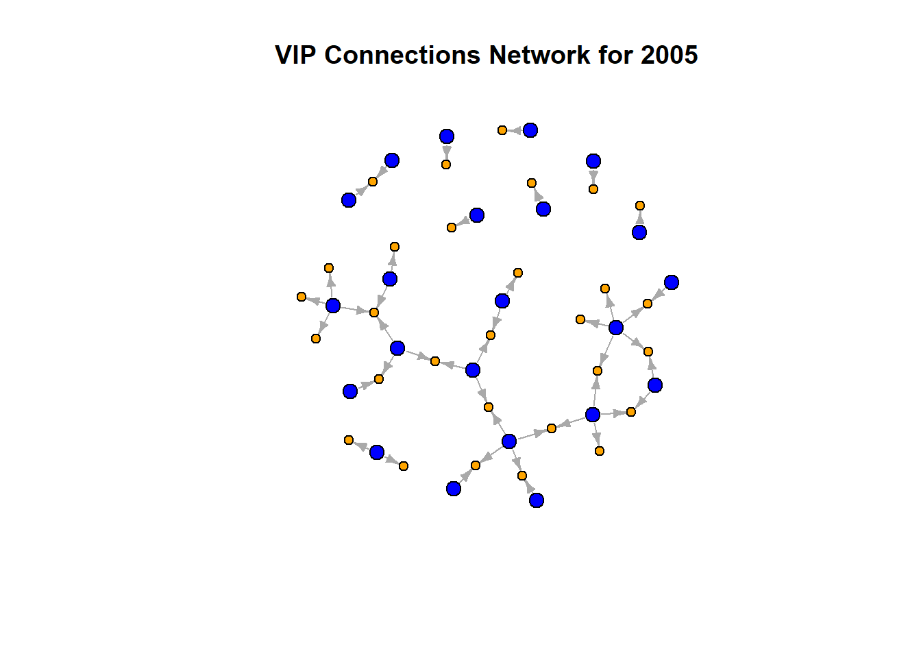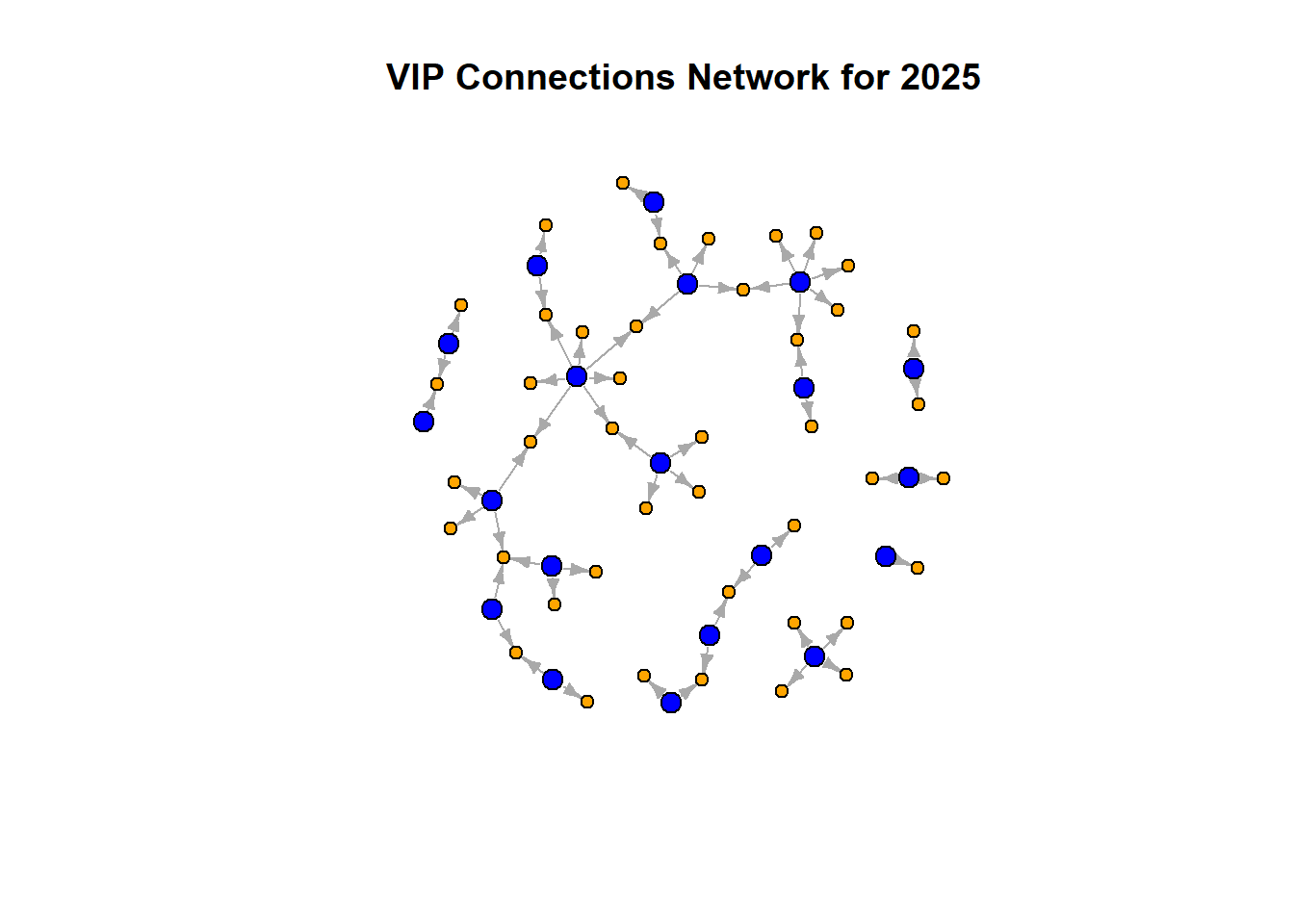 Finally, we filtered the ownership connections to include only those involving these 22 influential individuals (VIPs). By focusing on these connections, we can track how the influence of these key individuals changes over time and how their networks