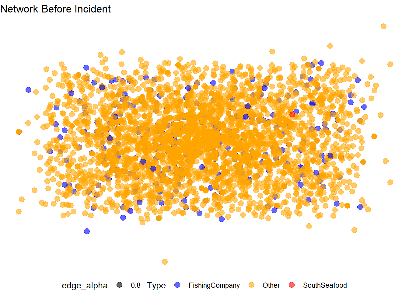 Visualize the network associated with SouthSeafood Express Corp and analyze how this network and competing businesses change due to their illegal fishing behavior.