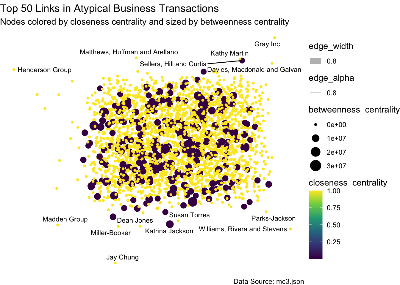 The above graph effectively highlights key players in atypical business transactions through centrality measures. Entities like Baxter-Turner, Kim Ellis, Theresa Frank, Henderson Group, and Rodriguez, Smith and Murray are central to the network, either due to their strategic positions (high betweenness centrality) or their connectivity (high closeness centrality). This visualization can help identify crucial nodes for further analysis or strategic planning in business networks.
