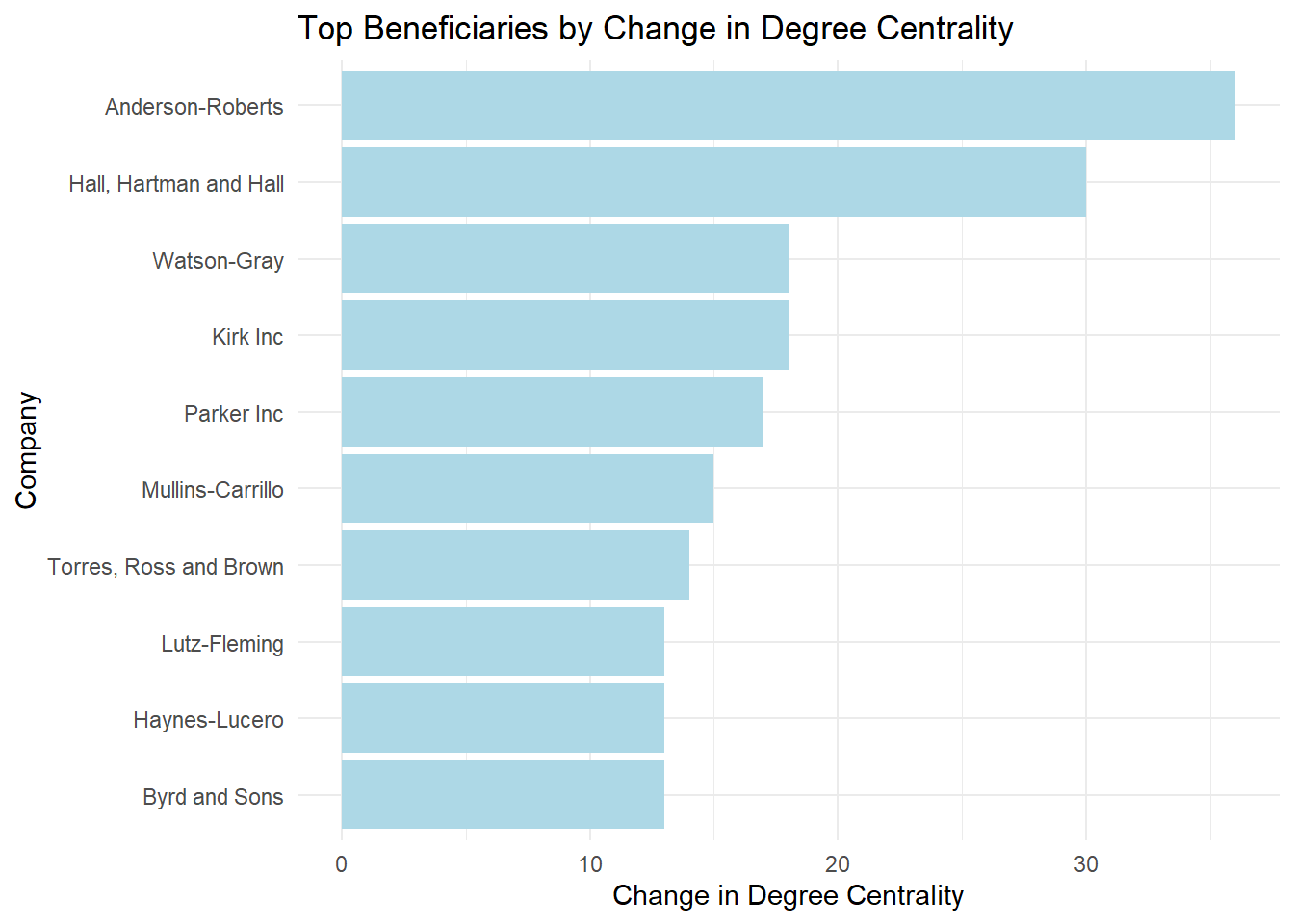 The results show that the top beneficiaries, all classified as fishing companies, significantly increased their network centrality following SouthSeafood Express Corp’s legal troubles. Anderson-Roberts, Hall, Hartman and Hall, and Kirk Inc., among others, saw the largest gains, suggesting they capitalized on the shift in the network’s structure.