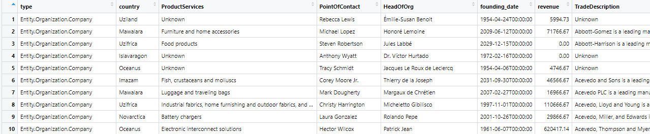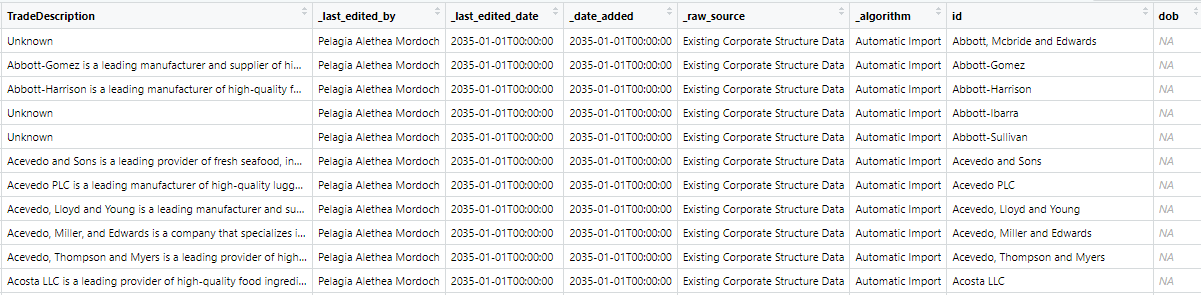 ..$ TradeDescription : chr [1:60520] "Unknown" "Abbott-Gomez is a leading manufacturer and supplier of high-quality furniture and home accessories, catering to"| __truncated__ "Abbott-Harrison is a leading manufacturer of high-quality food products, including baked goods, snacks, and bev"| __truncated__ "Unknown" ...