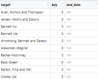 ..$ id : chr [1:60520] "Abbott, Mcbride and Edwards" "Abbott-Gomez" "Abbott-Harrison" "Abbott-Ibarra" ...